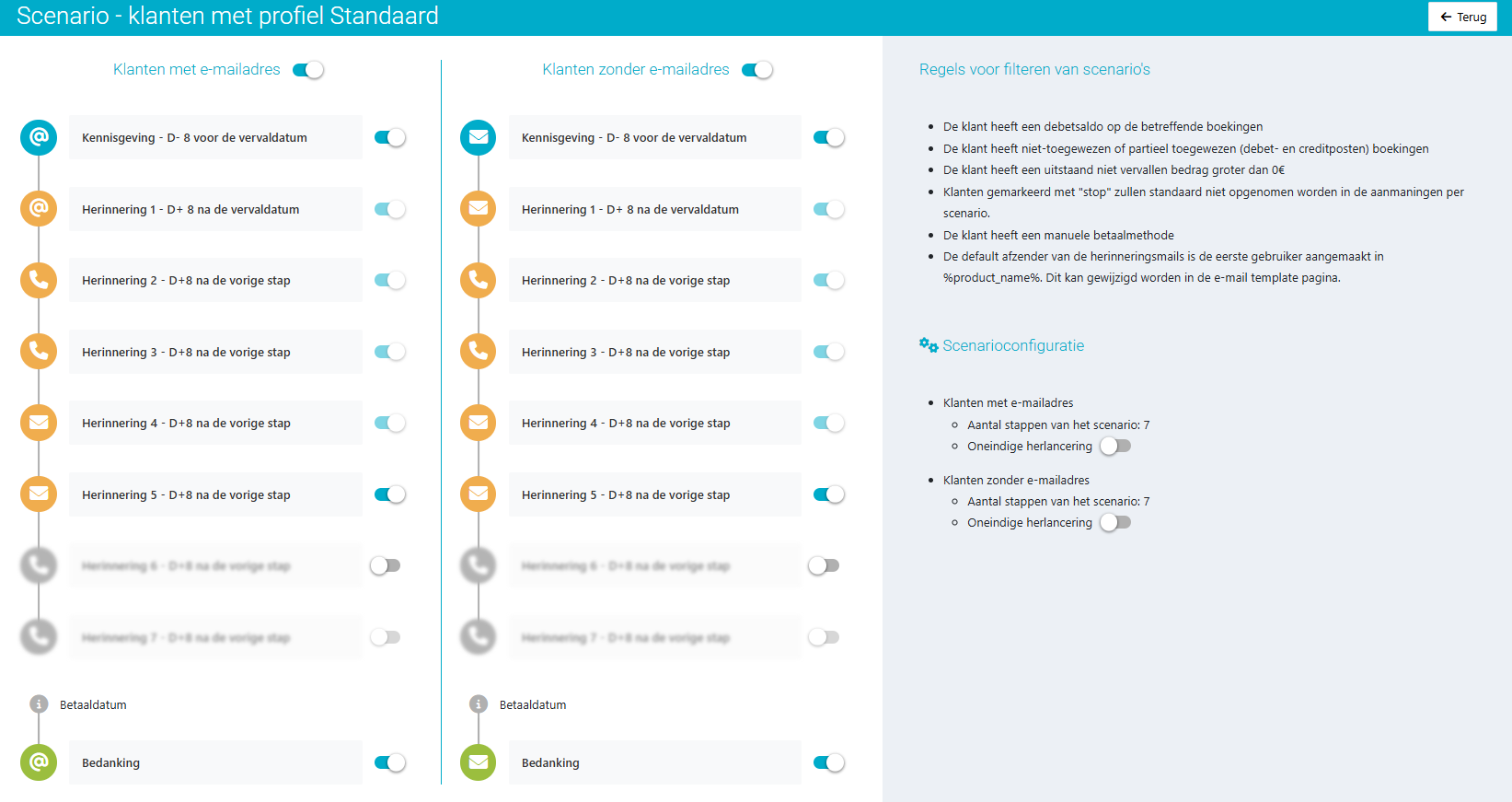 - Kies een referentiedatum voor opvolgingsstappen: start op basis van vervaldatum, factuurdatum of een aantal dagen na de vorige stap.